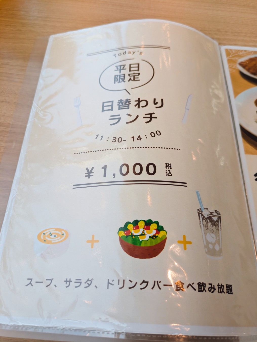 平日は日替わりランチも楽しめるとのこと。1,000円でスープ、サラダ、ドリンクバーが食べ飲み放題ってちょっとお得ですね。