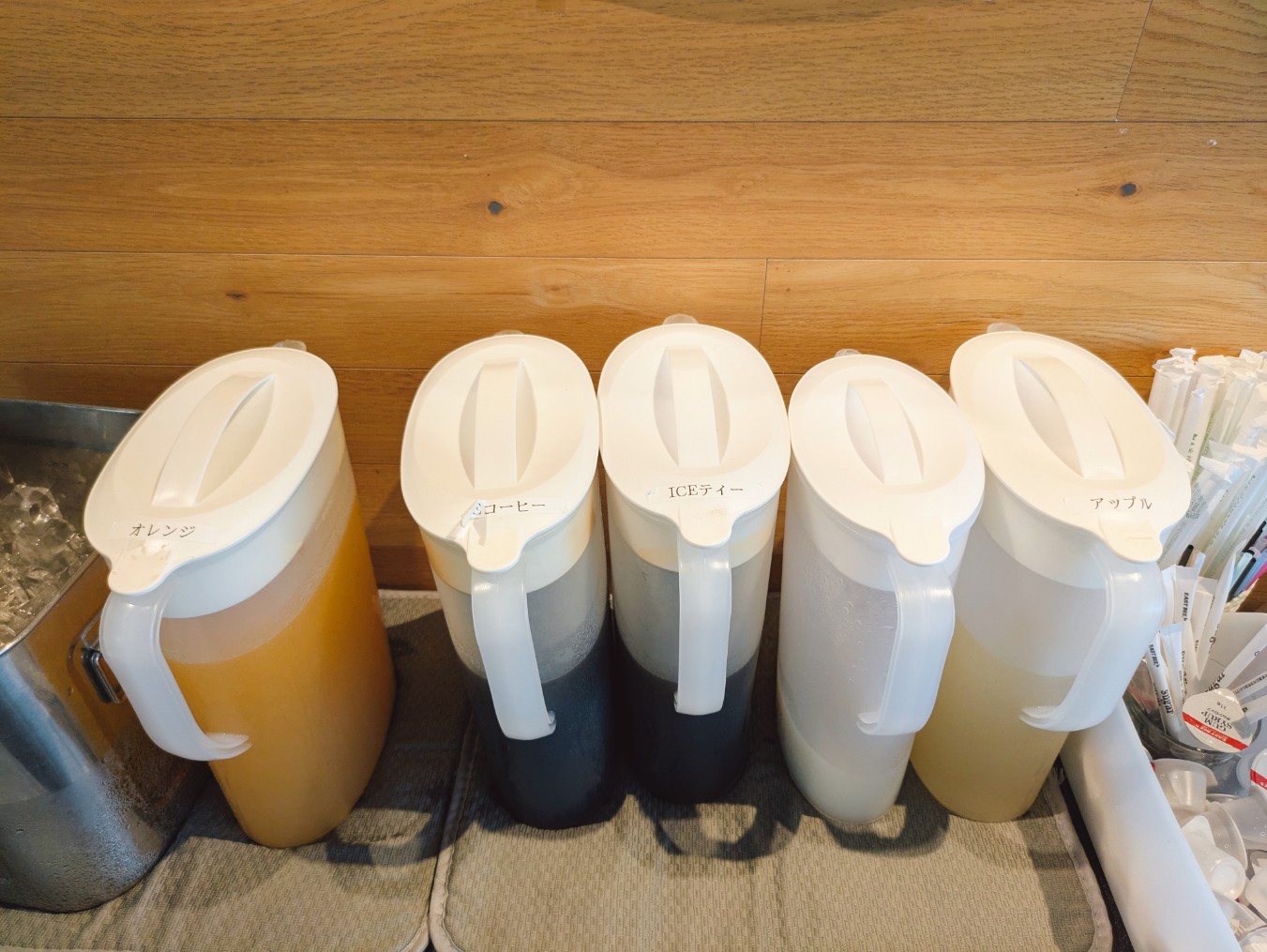 ドリンクはオレンジジュース、アップルジュース、アイスコーヒー、アイスティー…とあと一つから選べます。あと一つはシールが剥がれていてわかりませんでしたが、きっとカルピス的な何かでしょう。