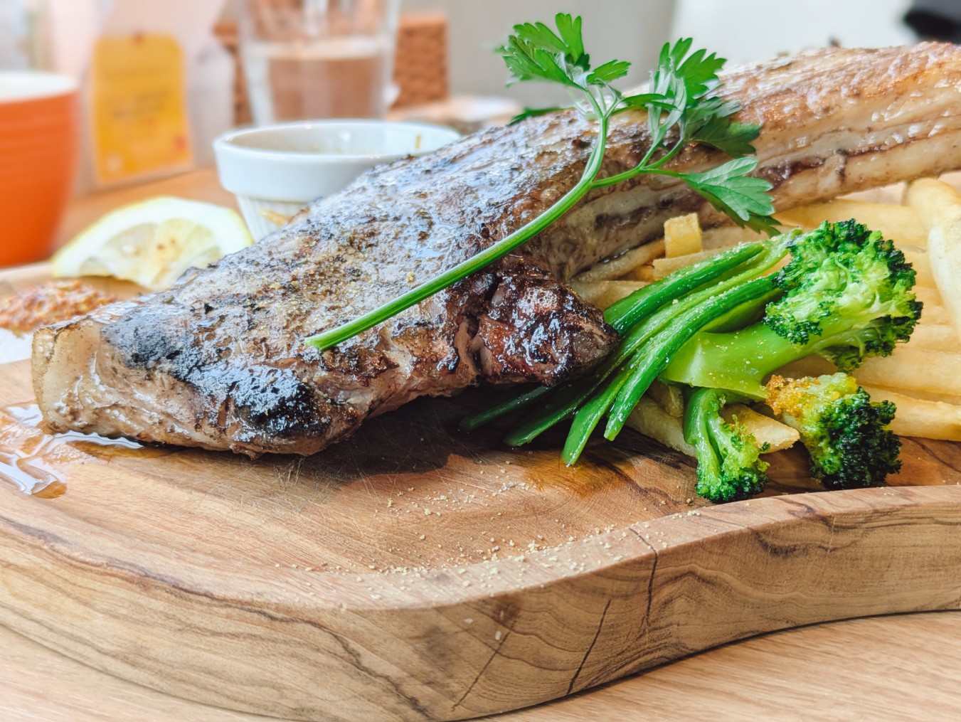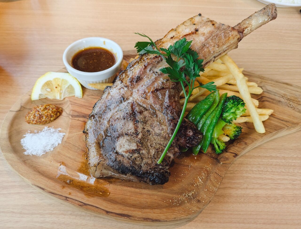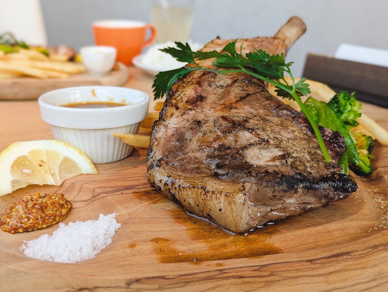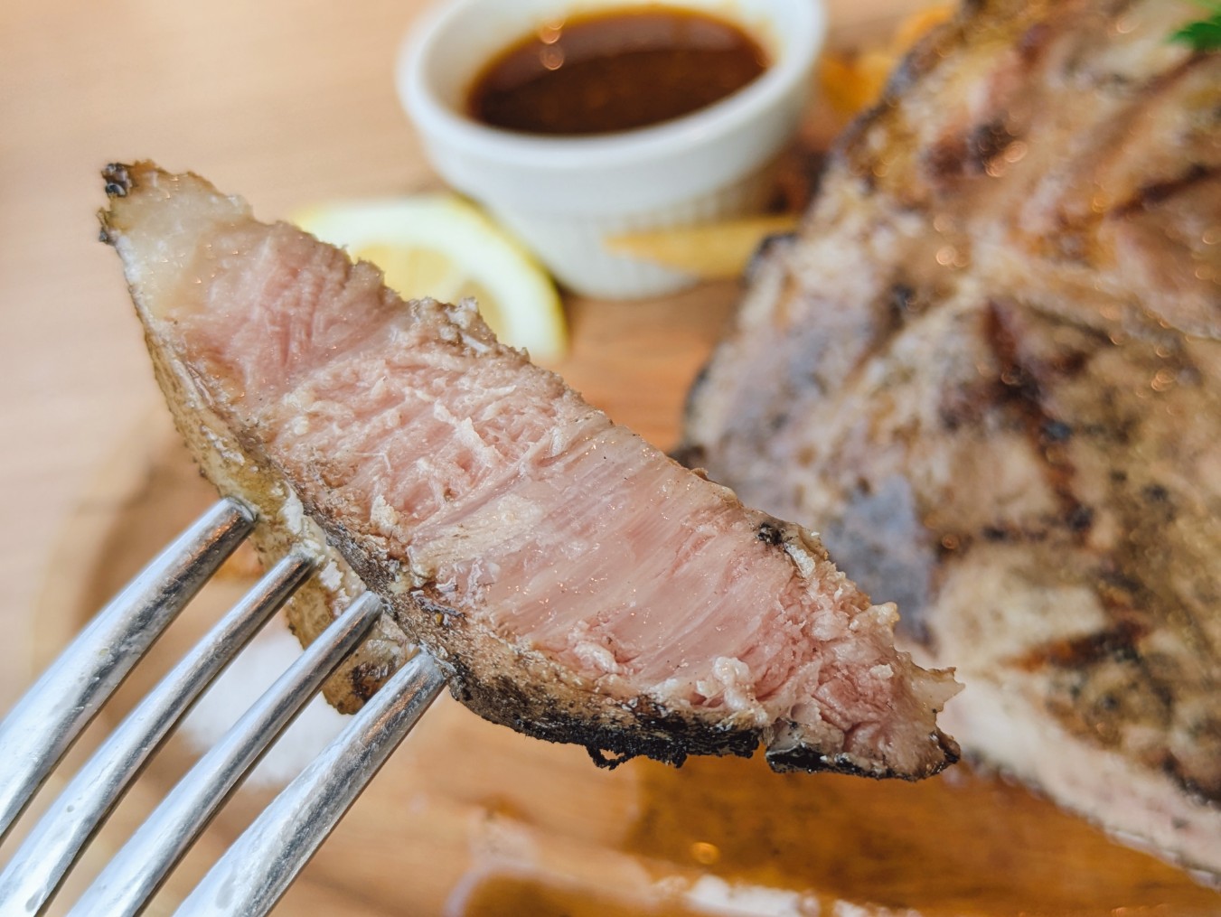 こちらはサーブされた瞬間からため息がもれてしまうほど美しいトマホーク。トマホークってミサイルのことかと思っていましたが、あばら骨付きの豚ロース肉のようです(調べた)。ネイティブアメリカンの武器である斧(トマホーク)に形が似ていたことから、そう呼ばれるようになったようです。