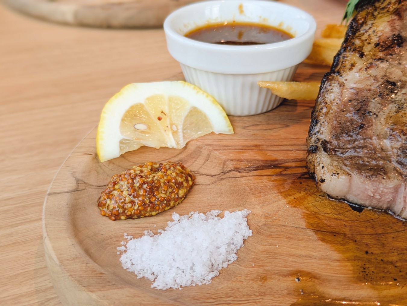 こちらも、塩、マスタード、レモン、オリジナルジャポネソースと合わせて。繰り返しになりますが、このジャポネソースはマジウマです。玉ねぎの辛味がジューシーなお肉と相性抜群です。