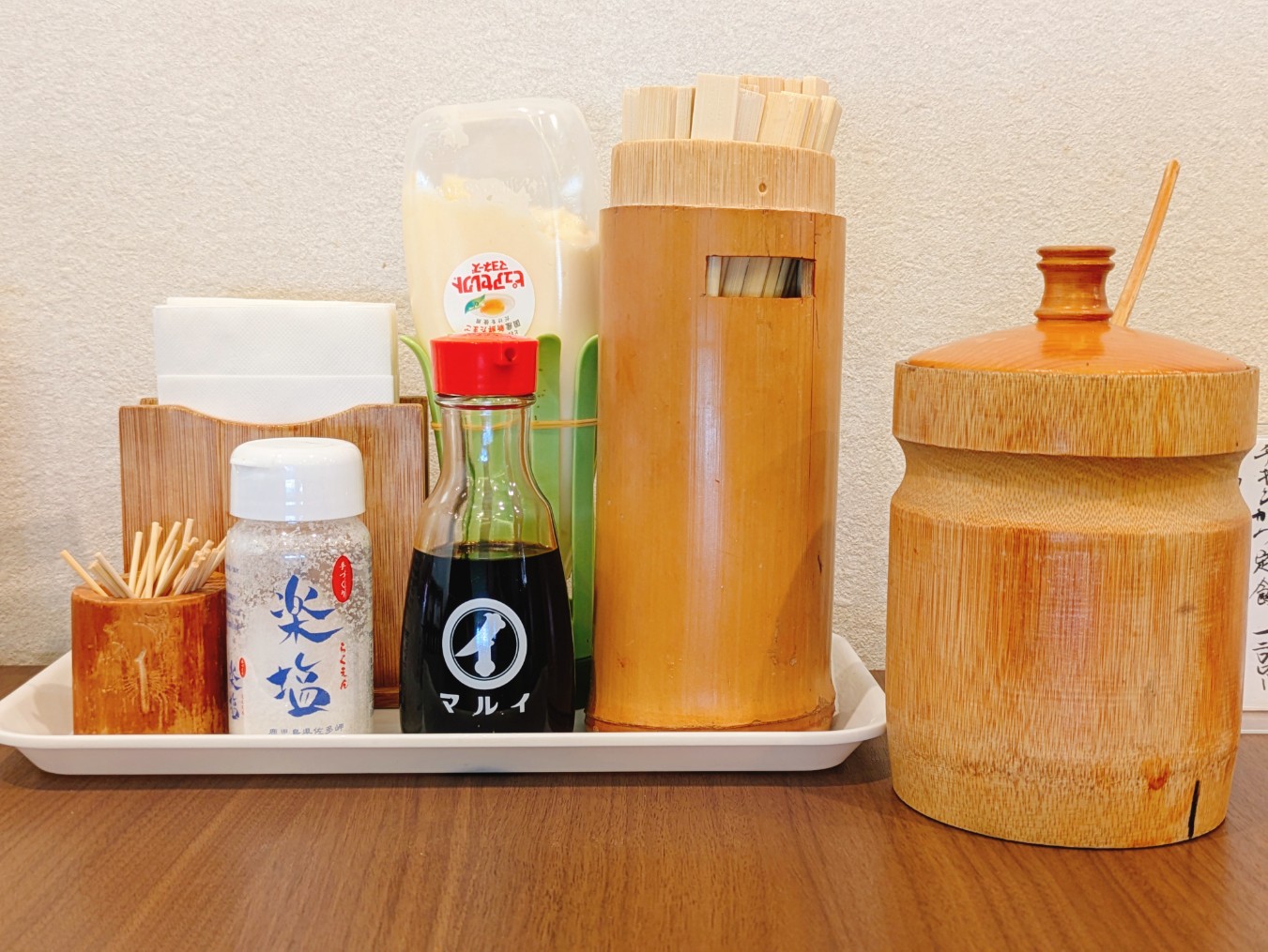 卓上には特製ソース、醤油、塩、マヨネーズのラインナップ。お好みでどうぞ。